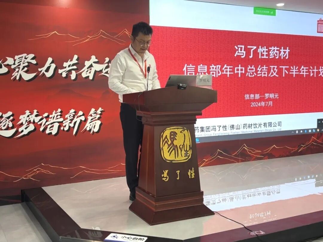 通过系统的财务报告,公司财务总监对2024年上半年经营业绩、财务状况等进行了客观、全面、透彻的评价,分析了企业目前存在的问题及可挖掘的潜力,为提高企业经营管理水平和经济效益提供了强有力的数据支撑。 ![]() 半年度销售情况分析 ![]() ![]() ![]() · 冯了性药业&药材副总经理-戚士文 · 冯了性药业营销部总监-于吉永 2024年上半年,在竞争激烈的市场环境下,冯了性药业、冯了性药材均采取了一系列行之有效的营销措施,包括研判当前形势、优化营销策略、加强渠道拓展、打造销售团队等,两家公司上半年营收与去年同比增幅均超20%,为顺利实现全年目标站稳了脚跟。 未来,冯了性药业、冯了性药材将进一步实现优势互补、融合发展,为促进企业高质量发展及四百年冯了性品牌持续发扬光大注入强大动力。 ![]() 各中层管理干部工作汇报 ![]() 冯了性药业 ✦ 左右滑动,查看更多 ✦ 冯了性药材 ✦ 左右滑动,查看更多 ✦ 冯了性药业、冯了性药材中层管理干部依次对各部门上半年工作进行了全面复盘、提炼亮点、分析不足,同时制定有效的优化举措,明确下半年重点工作目标及思路,以实现公司的战略目标为己任,创造价值。这份对目标方向的精准把握,将为企业全年经营目标的稳健达成构筑坚实的后盾! 总经理致辞 ![]() 会议上,公司总经理陈伟民充分肯定了各项工作的开展成果,并立足行业发展态势,紧贴市场需求变化,为我们描绘了企业未来三年的宏伟蓝图与核心业务发展战略。 陈总表示:未来三年,是挑战与机遇并存的三年,我们凭借深厚的文化底蕴、创新的研发实力、稳健的市场策略以及各部门展现出的精湛业务能力和团结协作精神,定能聚共识,谋新局! ![]() 人到半山不停步,船到中流当奋楫。 总结是终点,亦是起点,以匠心,敬初心,行致远。2024年下半年,冯了性药材、冯了性药业将持续围绕“十四五”发展规划、企业战略目标,聚焦问题态势,深度融合资源,赋能团队建设,优化服务管理,扎实开展各项业务,突出重点,狠抓落实,以无畏的勇气和坚定的信念迎接复杂多变的市场环境。 奋楫扬帆启新程,笃行不怠续辉煌 凝心聚力共奋进 , 同心逐梦谱新篇